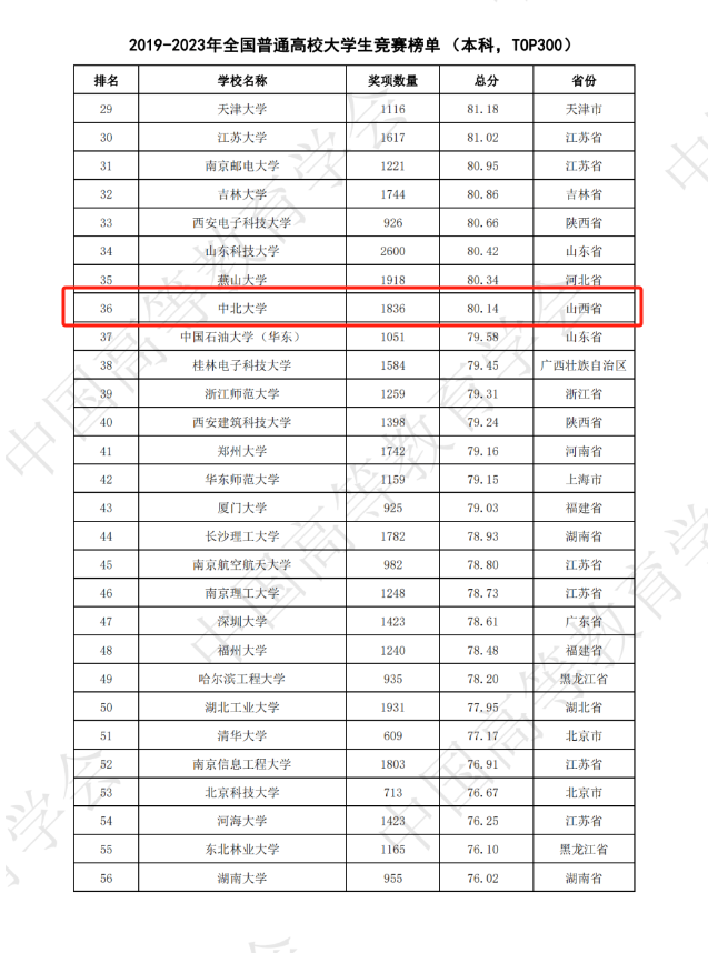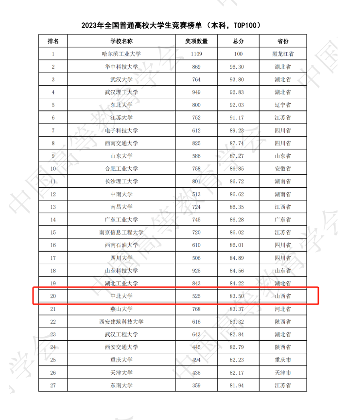 表现出色,以奖项数量525项,总分83.5分的成绩在2023年全国普通高校大学生竞赛榜单(本科,TOP100)中位列全国第20位,山西省首位。在2019-2023年全国普通高校大学生竞赛榜单(本科,TOP300)位列全国第36位。