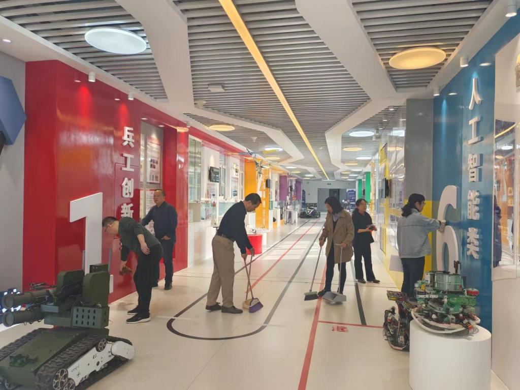 行政工会小组在学院高春强书记的带领下,在学院三层的大学生优秀创新创业教育成果对接交流中心开展活动,大家手拿扫把、抹布、簸箕等清扫工具,逐一对展区陈列品、展台及各个角落进行清理,同志们充分发扬不怕脏、不怕累的优良作风,干得热火朝天,为学生创新创业活动提供靓丽的环境。