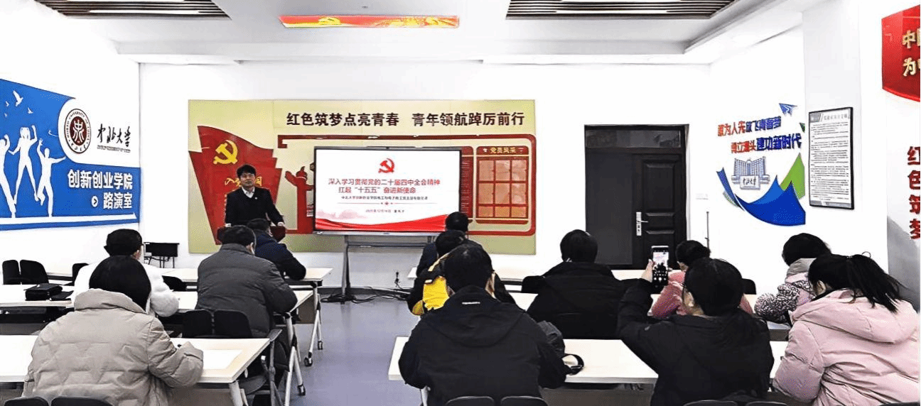 2025年12月9日下午,电工电子教工党支部邀请学院党总支委员、院长曹凤才在A405党员之家举行深入学习贯彻党的二十届四中全会精神学习宣讲会。曹凤才以《深入学习贯彻党的二十届四中全会精神、扛起“十五五“奋进新使命》为题,为电工电子教工党支部全体党员宣讲党的二十届四中全会精神。