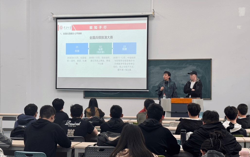 兵器作战推演仿真协会技术部部长、太行兵棋智能博弈联合实验室技术骨干余乐阳同学及协会优秀学生代表于浩闻、李昭桦担任主讲,吸引全校百余名对兵棋推演、军事仿真感兴趣的同学到场参与。
